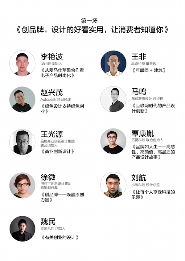 嘉宾简介:全职创业者、商业设计师,业余撰稿人,绘画爱好者;青萍科技有限公司 设计副总裁;光华龙腾中国百强设计师;中国工业设计协会理事时尚集团签约设计师;中科院计算技术研究所橙译中科等多家机构设计顾问;率团队遍揽国际顶尖奖项,仅2015年度即同时摘得IF、红点、IDEA等国际大奖;2013年策立互联网“新硬件”工作组,先后为小米、美的、墨迹天气、黄太吉等企业完成商业创新项目200余例;2015年进驻京东股权众筹生态圈,探索跨界整合与协作新模式。