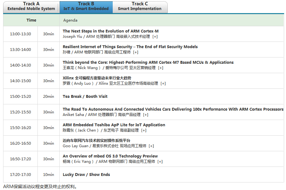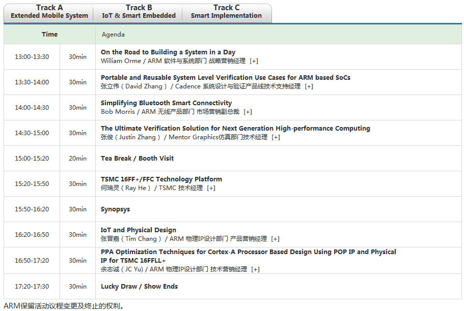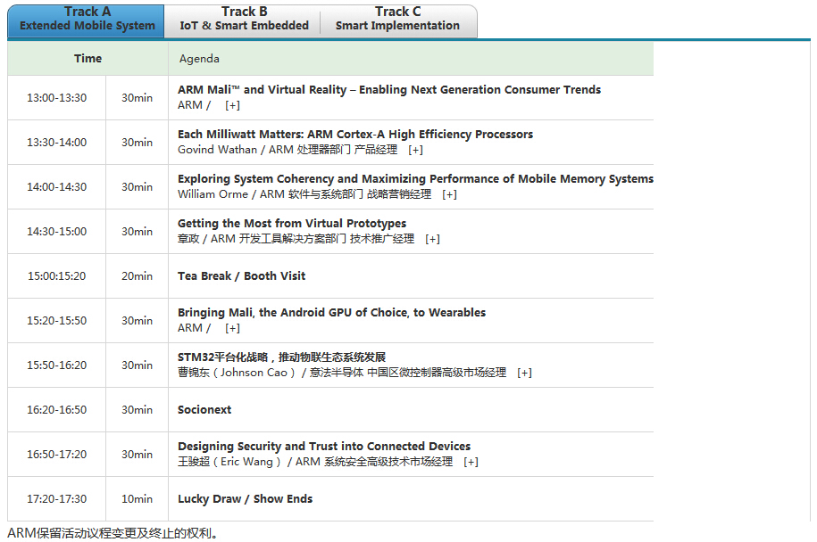 今年的分组技术演讲,将会邀请众多的产业合作伙伴与ARM资深技术专家围绕着“Extended Mobile System”、“IoT & Smart Embedded”、“Smart Implementation”三大议题进行深入探讨。活动现场重量级厂商将设展区,演示最先进的技术与产品。参加ARM年度技术论坛,您将一次收集到ARM产业生态体系最新的技术资讯,获得与不同领域的技术专家面对面交流的良机!