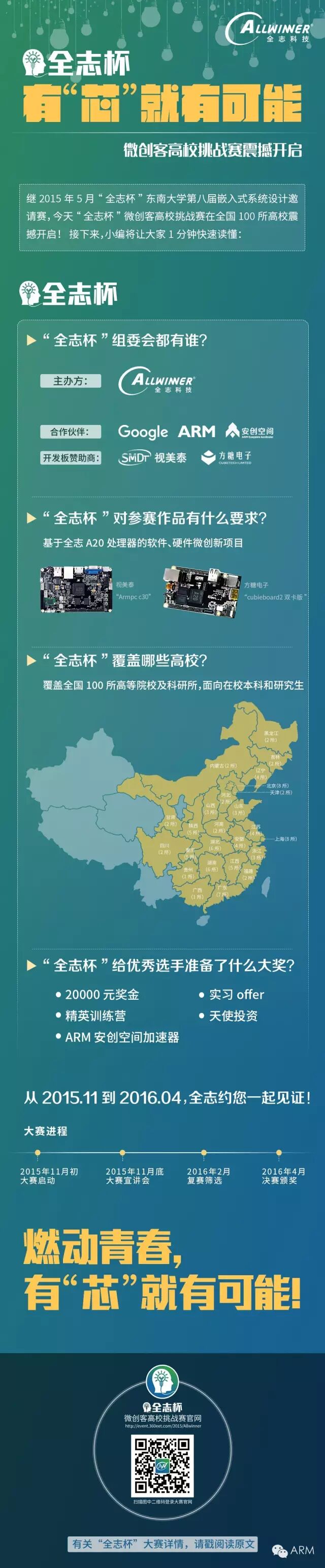 为了让同学们能够零距离感受电子设计的激情与魅力,以“有芯就有可能”为主题的2015年首届“全志杯”微创客高校挑战赛在全国百所高校震撼开启。11月2日赛事报名已全面展开,更有豪华奖品任君挑战!此次大赛由全志科技主办,携手Google、ARM共同合作,360eet电子工程网承办,方糖电子、视美泰倾力赞助。