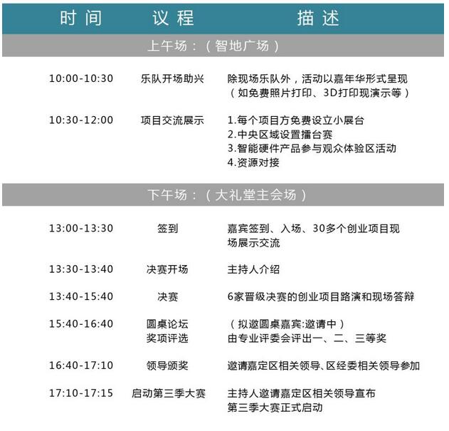 1、机器人仿生手和家庭社交机器人;2、车贴---开车不开车都补贴;3、互联网全自动快餐---中餐全自动+物联4G售卖O2O;4、货联网---货物跟踪系统;5、音乐“机器人”----DIY的音乐实验室;6、新能源充电运营平台--互联网+共享经济+智能硬件;7、AR Baby--虚拟与现实/文化创意类项目;8、蜡笔兔--智能家装APP和合作样板房/移动互联网类项目;9、码可示---工业机器人/高科技类项目;10、解放君---智能财务软件APP/移动互联网类项目;11、海翼知---数据语义融合平台/大数据处理类项目;12、极奥科技--浮动车大数据平台--汽车后市场类;13、家门口的智能快递箱---智能硬件类;14、光纤温度传感器芯片器件与系统--高科技类;15、虚拟全景房产项目--虚拟与现实/TMT类;16、健康守护卫士--健康管理平台/医疗健康类;16、全视潮人--VR/文化创意类;17、桌面无线充电系统--智能硬件类;18、无人机三轴云台和影视拍摄四轴云台--高科技类;19、幻盒文化--新媒体类;20、e鲜水果B2B平台--电商平台类;21、悦右--新型建筑外墙材料/绿色环保类;22、幻舞动漫科技--全息动漫/文化创意类;23、智能啤酒鲜酿机--智能硬件类;24、频率控制核心组件---智能电网和军工通信项目/高科技类;25、灵客智能---智能家居类;26、3D打印机以及3D打印生态平台;27、创来智能驾驶—车道偏离预警系统;28、安驾网络--智能硬件+APP;29、小爱智能---语音导航;30、聚豹汇;31、途鸟配送