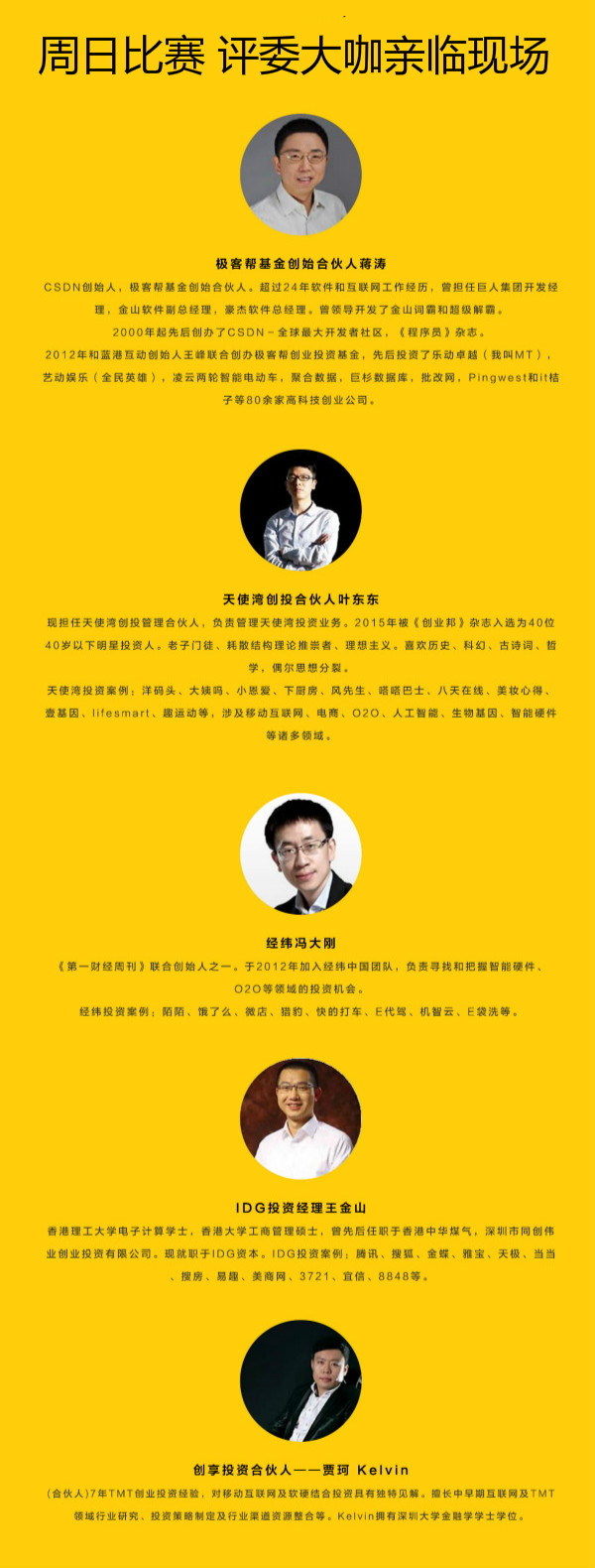 聚集技术人才(软件硬件都可以)和设计师以及真正有奇思妙想的人,在一个周末的时间内,创造出自己的作品。如果正好参与者的项目能成为创业项目,那么我们也会帮小伙伴对接投资人。