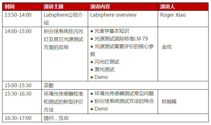 此次交流会,我们将会向各位分享在消费类电子设备中测试和评价光学性能的新型方法----积分球系统。着重介绍,积分球系统在消费电子产品中测试,如闪光灯、穿戴设备的指示光源、红外及其激光指示光源等。当然我们也会介绍积分球光源方法测试环境光传感器的方法,以及和灯箱测试的一些对比情况。