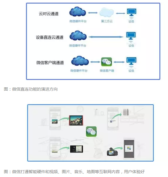 从2015年3月-8月,微信硬件开发板、内置AirKiss和AirSync的wifi和蓝牙模块陆续亮相。并且创新的产品开始陆续登场,腾讯独立开发并设计的微信相框、微信智能路由解决方案支持微信好友wifi免登陆接入。并且公布八大行业解决方案,空调、玩具、路由器、家居、电视、充值、健康、穿戴。《智慧产品圈》了解到之前微信与设备的连接还须经过第三方云,即设备的数据规范和接口并不统一,这也限制了微信云联动控制设备、对同类产品开发应用的统一管理。