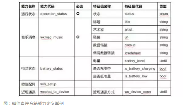 其中,微信规范智能硬件接口的方式是定义设备能力(如开关、音乐播放、灯光调节)和特征值(一个或多个),并要求所有相同类型的智能硬件follow。