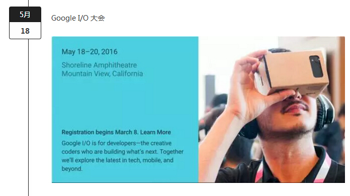 每年谷歌最重要的发布会,地位相当于苹果的WWDC。之前Google Cardboard就是在 I/O上发布的。