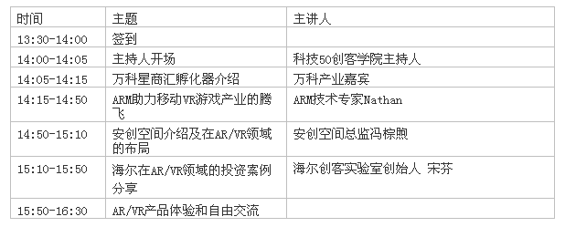 由ARM安创空间、万科星商汇、海尔创客实验室、CIE大链盟、科技50等智能硬件领域支持机构共同主办“众星云集共同打造AR/VR生态系统——AR/VR专题分享沙龙”,将现场分享ARM的技术及市场资源以及中科创达在移动OS和参考设计方面经验,为开发者提供VR领域的开发加速和规模量产的资源对接,对AR/VR创业团队进行资源引荐及品牌宣传推广,期待共同打造VR生态系统,助力产业发展。