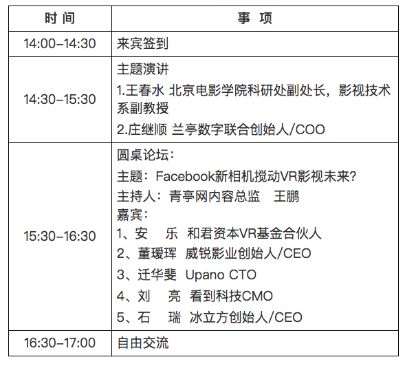 第26期沙龙将于2017年5月11日(周四)下午14:30在九思文创园(北京市西城区西什库大街31号院,地铁4号线西四站向东900米,西什库大街与大红罗厂街交叉口向西50米)举行,由青亭网联合承办,文化创新工场协办。本次沙龙的主题为“Facebook新相机搅动VR影视未来?”,邀请嘉宾为北京电影学院科研处副处长王春水、兰亭数字联合创始人庄继顺,并有多位行业嘉宾分享讨论。