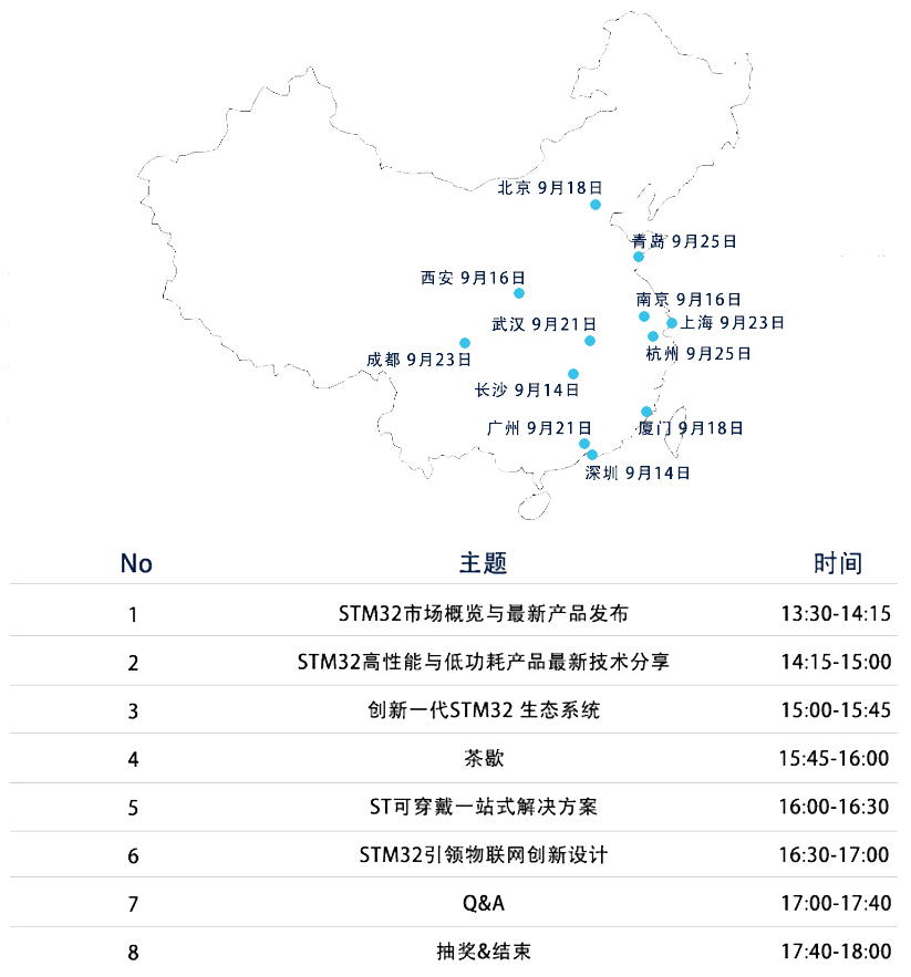 意法半导体公司谨定于2015年9月14日至25日在12个城市召开STM32全国巡回研讨会。本次研讨会将为您呈现STM32的最新产品、技术和完整的生态系统,涵盖