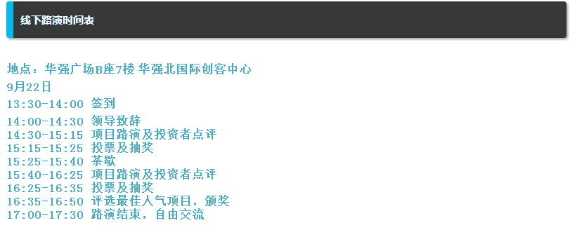 2. 线下交流:9月22日13:30-17:30,路演各方齐聚华强北国际创客中心,投融双方通过线下活动展开深入交流。